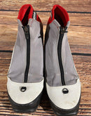 Boots are the most obviously distinctive family of nordic ski boots. They have a 75mm wide "duck bill" at the front of the boot, with three holes on the bottom of the bill that line up with the pins on their appropriate binding.