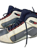 Boots are the most obviously distinctive family of nordic ski boots. They have a 75mm wide "duck bill" at the front of the boot, with three holes on the bottom of the bill that line up with the pins on their appropriate binding.