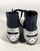 Boots are the most obviously distinctive family of nordic ski boots. They have a 75mm wide "duck bill" at the front of the boot, with three holes on the bottom of the bill that line up with the pins on their appropriate binding.