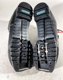 Boots are the most obviously distinctive family of nordic ski boots. They have a 75mm wide "duck bill" at the front of the boot, with three holes on the bottom of the bill that line up with the pins on their appropriate binding.
