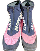 Boots are the most obviously distinctive family of nordic ski boots. They have a 75mm wide "duck bill" at the front of the boot, with three holes on the bottom of the bill that line up with the pins on their appropriate binding.