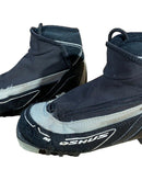 Boots are the most obviously distinctive family of nordic ski boots. They have a 75mm wide "duck bill" at the front of the boot, with three holes on the bottom of the bill that line up with the pins on their appropriate binding.