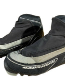Boots are the most obviously distinctive family of nordic ski boots. They have a 75mm wide "duck bill" at the front of the boot, with three holes on the bottom of the bill that line up with the pins on their appropriate binding.