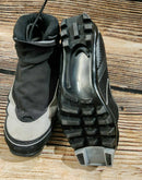 Boots are the most obviously distinctive family of nordic ski boots. They have a 75mm wide "duck bill" at the front of the boot, with three holes on the bottom of the bill that line up with the pins on their appropriate binding.