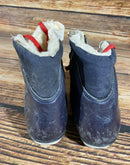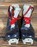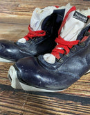 Boots are the most obviously distinctive family of Nordic ski boots. They have a 75mm wide "duck bill" at the front of the boot, with three holes on the bottom of the bill that line up with the pins on their appropriate binding.