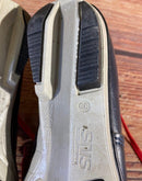 Boots are the most obviously distinctive family of nordic ski boots. They have a 75mm wide "duck bill" at the front of the boot, with three holes on the bottom of the bill that line up with the pins on their appropriate binding.