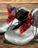 Boots are the most obviously distinctive family of Nordic ski boots. They have a 75mm wide "duck bill" at the front of the boot, with three holes on the bottom of the bill that line up with the pins on their appropriate binding.