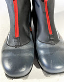 Boots are the most obviously distinctive family of nordic ski boots. They have a 75mm wide "duck bill" at the front of the boot, with three holes on the bottom of the bill that line up with the pins on their appropriate binding.