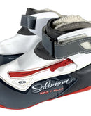 Boots are the most obviously distinctive family of nordic ski boots. They have a 75mm wide "duck bill" at the front of the boot, with three holes on the bottom of the bill that line up with the pins on their appropriate binding.