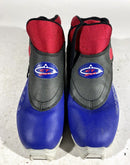 Boots are the most obviously distinctive family of nordic ski boots. They have a 75mm wide "duck bill" at the front of the boot, with three holes on the bottom of the bill that line up with the pins on their appropriate binding.
