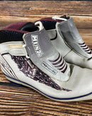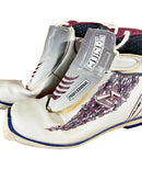 Boots are the most obviously distinctive family of nordic ski boots. They have a 75mm wide "duck bill" at the front of the boot, with three holes on the bottom of the bill that line up with the pins on their appropriate binding.
