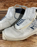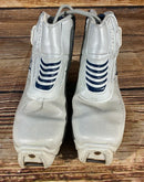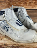 Boots are the most obviously distinctive family of Nordic ski boots. They have a 75mm wide "duck bill" at the front of the boot, with three holes on the bottom of the bill that line up with the pins on their appropriate binding.