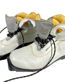 Boots are the most obviously distinctive family of nordic ski boots. They have a 75mm wide "duck bill" at the front of the boot, with three holes on the bottom of the bill that line up with the pins on their appropriate binding.