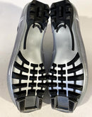 Boots are the most obviously distinctive family of nordic ski boots. They have a 75mm wide "duck bill" at the front of the boot, with three holes on the bottom of the bill that line up with the pins on their appropriate binding.