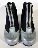 Boots are the most obviously distinctive family of nordic ski boots. They have a 75mm wide "duck bill" at the front of the boot, with three holes on the bottom of the bill that line up with the pins on their appropriate binding.