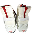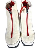 Boots are the most obviously distinctive family of nordic ski boots. They have a 75mm wide "duck bill" at the front of the boot, with three holes on the bottom of the bill that line up with the pins on their appropriate binding.