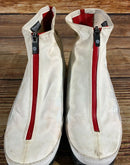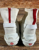 Boots are the most obviously distinctive family of nordic ski boots. They have a 75mm wide "duck bill" at the front of the boot, with three holes on the bottom of the bill that line up with the pins on their appropriate binding.