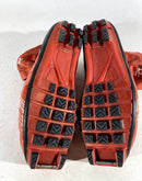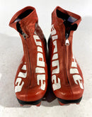 Boots are the most obviously distinctive family of nordic ski boots. They have a 75mm wide "duck bill" at the front of the boot, with three holes on the bottom of the bill that line up with the pins on their appropriate binding.
