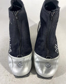 Boots are the most obviously distinctive family of nordic ski boots. They have a 75mm wide "duck bill" at the front of the boot, with three holes on the bottom of the bill that line up with the pins on their appropriate binding.