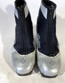 Boots are the most obviously distinctive family of nordic ski boots. They have a 75mm wide "duck bill" at the front of the boot, with three holes on the bottom of the bill that line up with the pins on their appropriate binding.