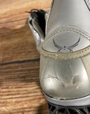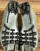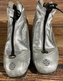 Boots are the most obviously distinctive family of nordic ski boots. They have a 75mm wide "duck bill" at the front of the boot, with three holes on the bottom of the bill that line up with the pins on their appropriate binding.