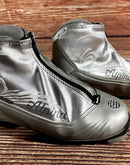 Boots are the most obviously distinctive family of nordic ski boots. They have a 75mm wide "duck bill" at the front of the boot, with three holes on the bottom of the bill that line up with the pins on their appropriate binding.