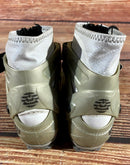 Boots are the most obviously distinctive family of nordic ski boots. They have a 75mm wide "duck bill" at the front of the boot, with three holes on the bottom of the bill that line up with the pins on their appropriate binding.