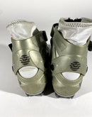 Boots are the most obviously distinctive family of nordic ski boots. They have a 75mm wide "duck bill" at the front of the boot, with three holes on the bottom of the bill that line up with the pins on their appropriate binding.