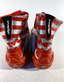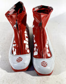 Boots are the most obviously distinctive family of nordic ski boots. They have a 75mm wide "duck bill" at the front of the boot, with three holes on the bottom of the bill that line up with the pins on their appropriate binding.