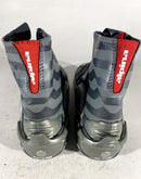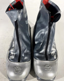 Boots are the most obviously distinctive family of nordic ski boots. They have a 75mm wide "duck bill" at the front of the boot, with three holes on the bottom of the bill that line up with the pins on their appropriate binding.