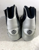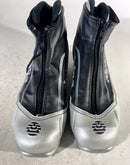 Boots are the most obviously distinctive family of nordic ski boots. They have a 75mm wide "duck bill" at the front of the boot, with three holes on the bottom of the bill that line up with the pins on their appropriate binding.