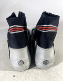 Boots are the most obviously distinctive family of nordic ski boots. They have a 75mm wide "duck bill" at the front of the boot, with three holes on the bottom of the bill that line up with the pins on their appropriate binding.