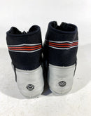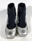 Boots are the most obviously distinctive family of nordic ski boots. They have a 75mm wide "duck bill" at the front of the boot, with three holes on the bottom of the bill that line up with the pins on their appropriate binding.