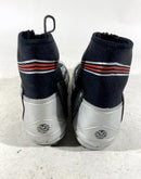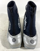 Boots are the most obviously distinctive family of nordic ski boots. They have a 75mm wide "duck bill" at the front of the boot, with three holes on the bottom of the bill that line up with the pins on their appropriate binding.