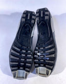 Boots are the most obviously distinctive family of nordic ski boots. They have a 75mm wide "duck bill" at the front of the boot, with three holes on the bottom of the bill that line up with the pins on their appropriate binding.