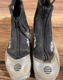 Boots are the most obviously distinctive family of nordic ski boots. They have a 75mm wide "duck bill" at the front of the boot, with three holes on the bottom of the bill that line up with the pins on their appropriate binding.