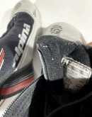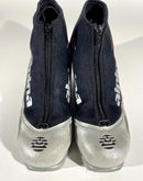 Boots are the most obviously distinctive family of nordic ski boots. They have a 75mm wide "duck bill" at the front of the boot, with three holes on the bottom of the bill that line up with the pins on their appropriate binding.