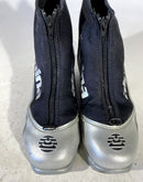 Boots are the most obviously distinctive family of nordic ski boots. They have a 75mm wide "duck bill" at the front of the boot, with three holes on the bottom of the bill that line up with the pins on their appropriate binding.