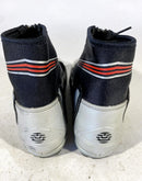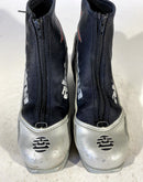 Boots are the most obviously distinctive family of nordic ski boots. They have a 75mm wide "duck bill" at the front of the boot, with three holes on the bottom of the bill that line up with the pins on their appropriate binding.