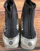 Boots are the most obviously distinctive family of nordic ski boots. They have a 75mm wide "duck bill" at the front of the boot, with three holes on the bottom of the bill that line up with the pins on their appropriate binding.