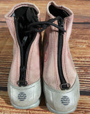 Boots are the most obviously distinctive family of nordic ski boots. They have a 75mm wide "duck bill" at the front of the boot, with three holes on the bottom of the bill that line up with the pins on their appropriate binding.