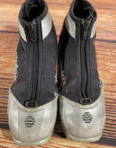 Boots are the most obviously distinctive family of nordic ski boots. They have a 75mm wide "duck bill" at the front of the boot, with three holes on the bottom of the bill that line up with the pins on their appropriate binding.