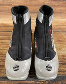 Boots are the most obviously distinctive family of nordic ski boots. They have a 75mm wide "duck bill" at the front of the boot, with three holes on the bottom of the bill that line up with the pins on their appropriate binding.