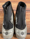 Boots are the most obviously distinctive family of nordic ski boots. They have a 75mm wide "duck bill" at the front of the boot, with three holes on the bottom of the bill that line up with the pins on their appropriate binding.