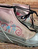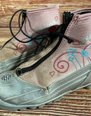 Boots are the most obviously distinctive family of nordic ski boots. They have a 75mm wide "duck bill" at the front of the boot, with three holes on the bottom of the bill that line up with the pins on their appropriate binding.