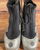 Boots are the most obviously distinctive family of nordic ski boots. They have a 75mm wide "duck bill" at the front of the boot, with three holes on the bottom of the bill that line up with the pins on their appropriate binding.