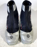Boots are the most obviously distinctive family of nordic ski boots. They have a 75mm wide "duck bill" at the front of the boot, with three holes on the bottom of the bill that line up with the pins on their appropriate binding.