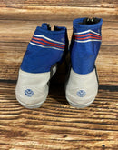 Boots are the most obviously distinctive family of nordic ski boots. They have a 75mm wide "duck bill" at the front of the boot, with three holes on the bottom of the bill that line up with the pins on their appropriate binding.
