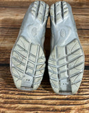 Boots are the most obviously distinctive family of nordic ski boots. They have a 75mm wide "duck bill" at the front of the boot, with three holes on the bottom of the bill that line up with the pins on their appropriate binding.