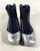 Boots are the most obviously distinctive family of nordic ski boots. They have a 75mm wide "duck bill" at the front of the boot, with three holes on the bottom of the bill that line up with the pins on their appropriate binding.